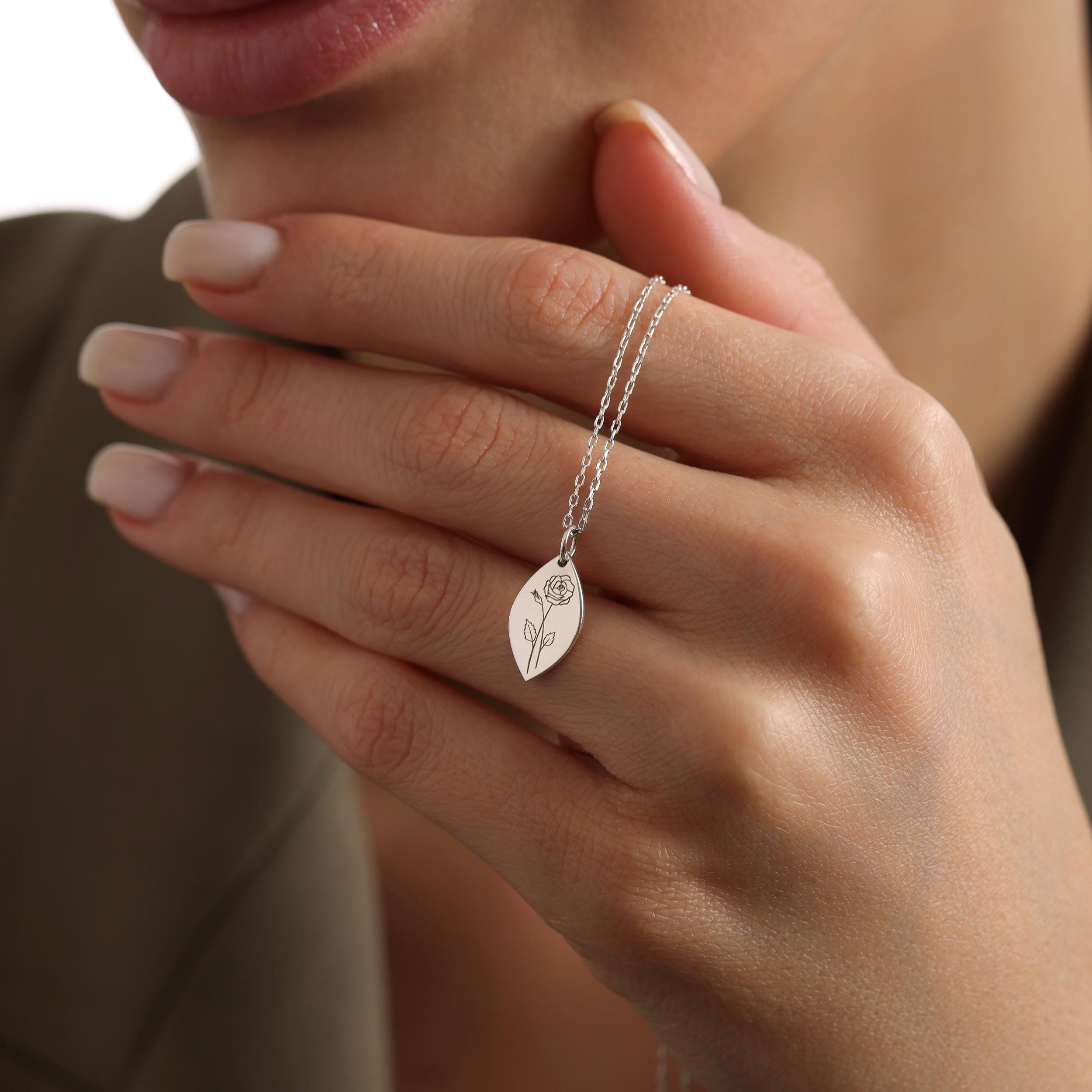 Personalized Birth Flower Necklace: Engraved Sterling Silver Pendant