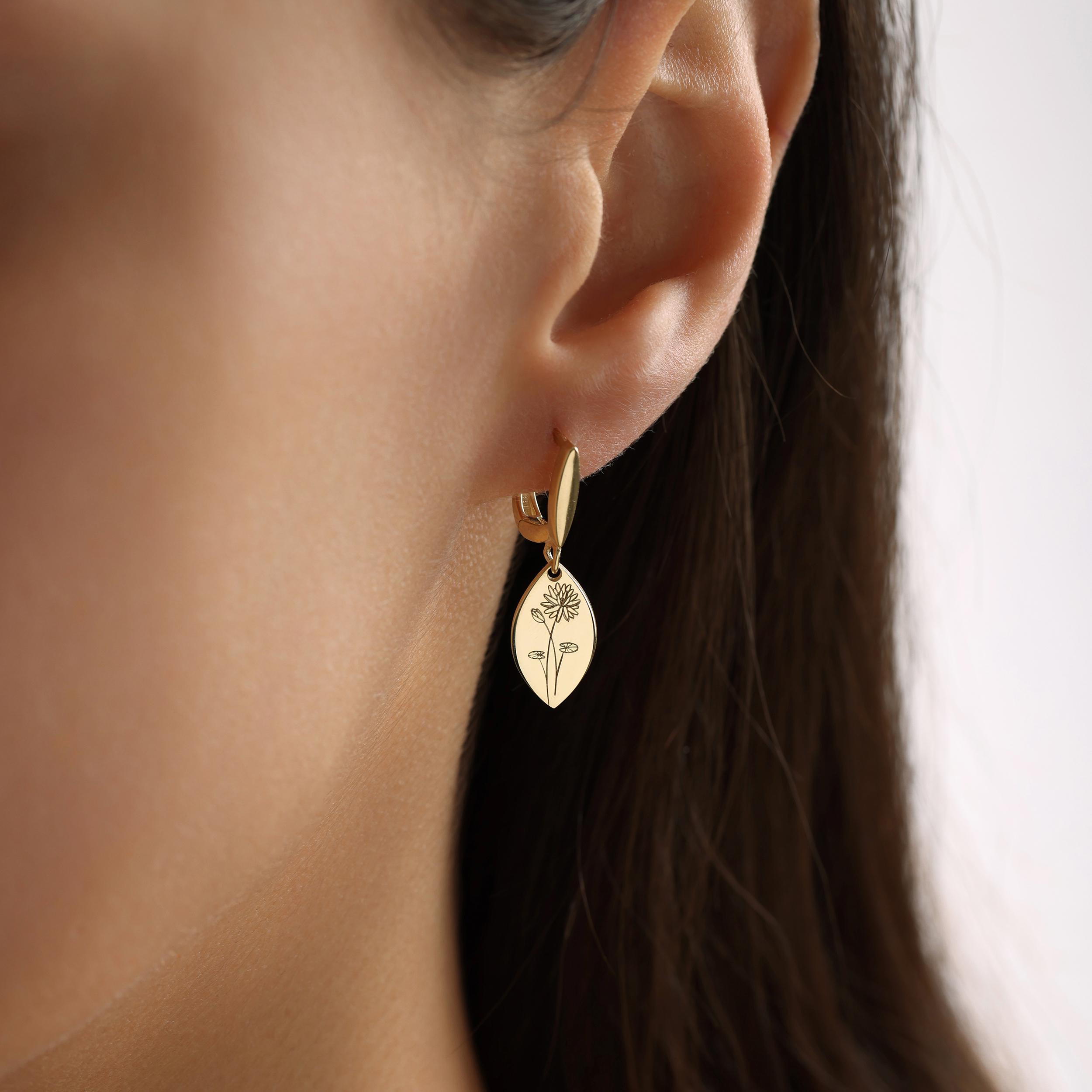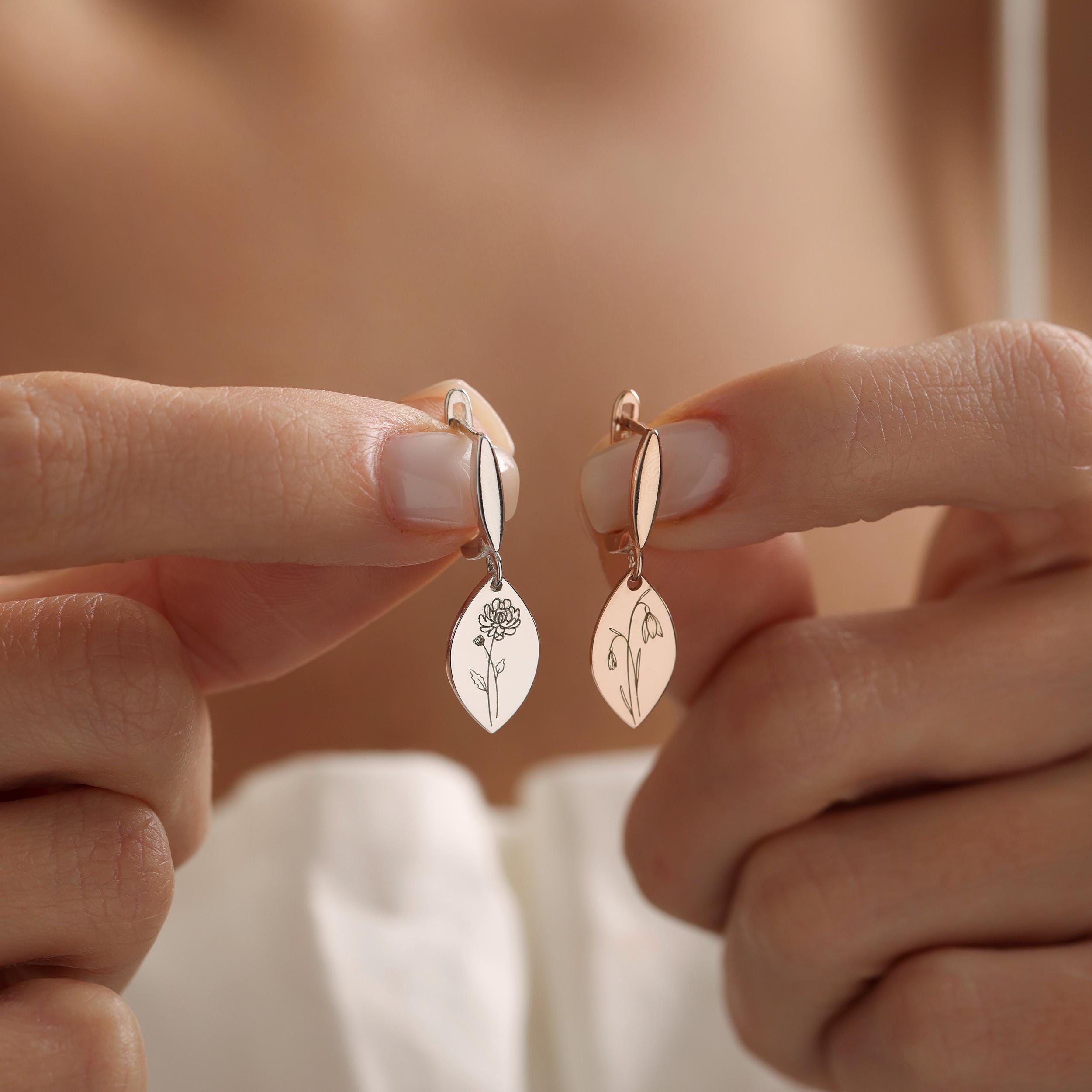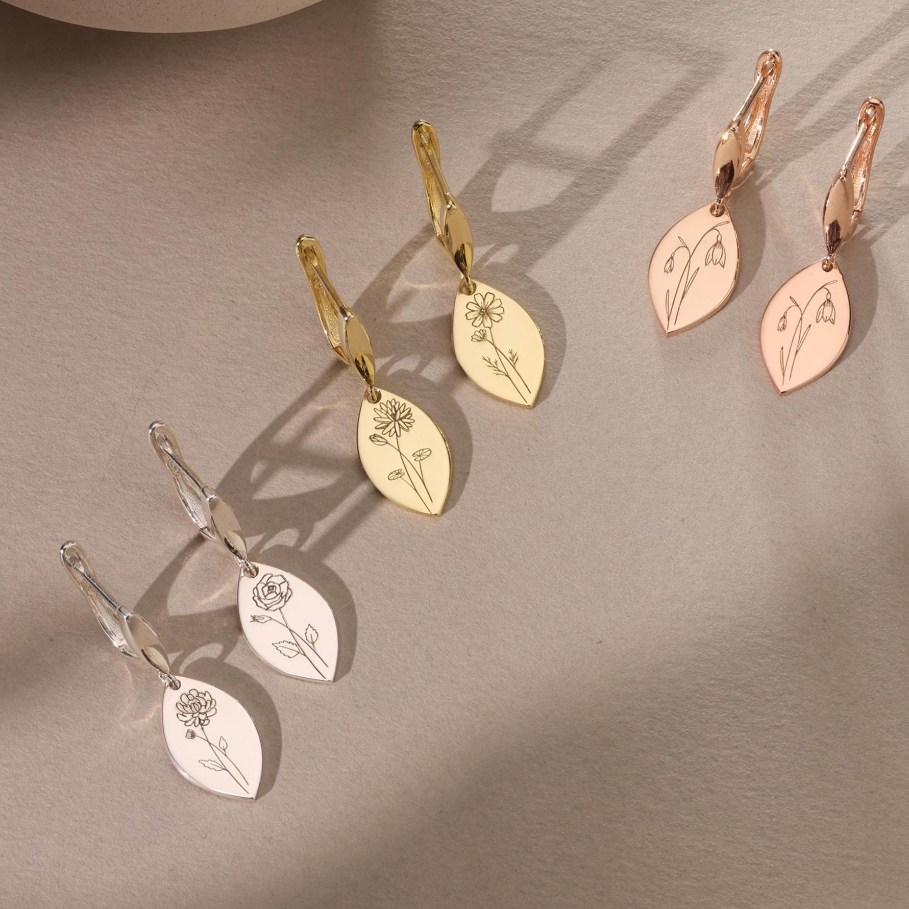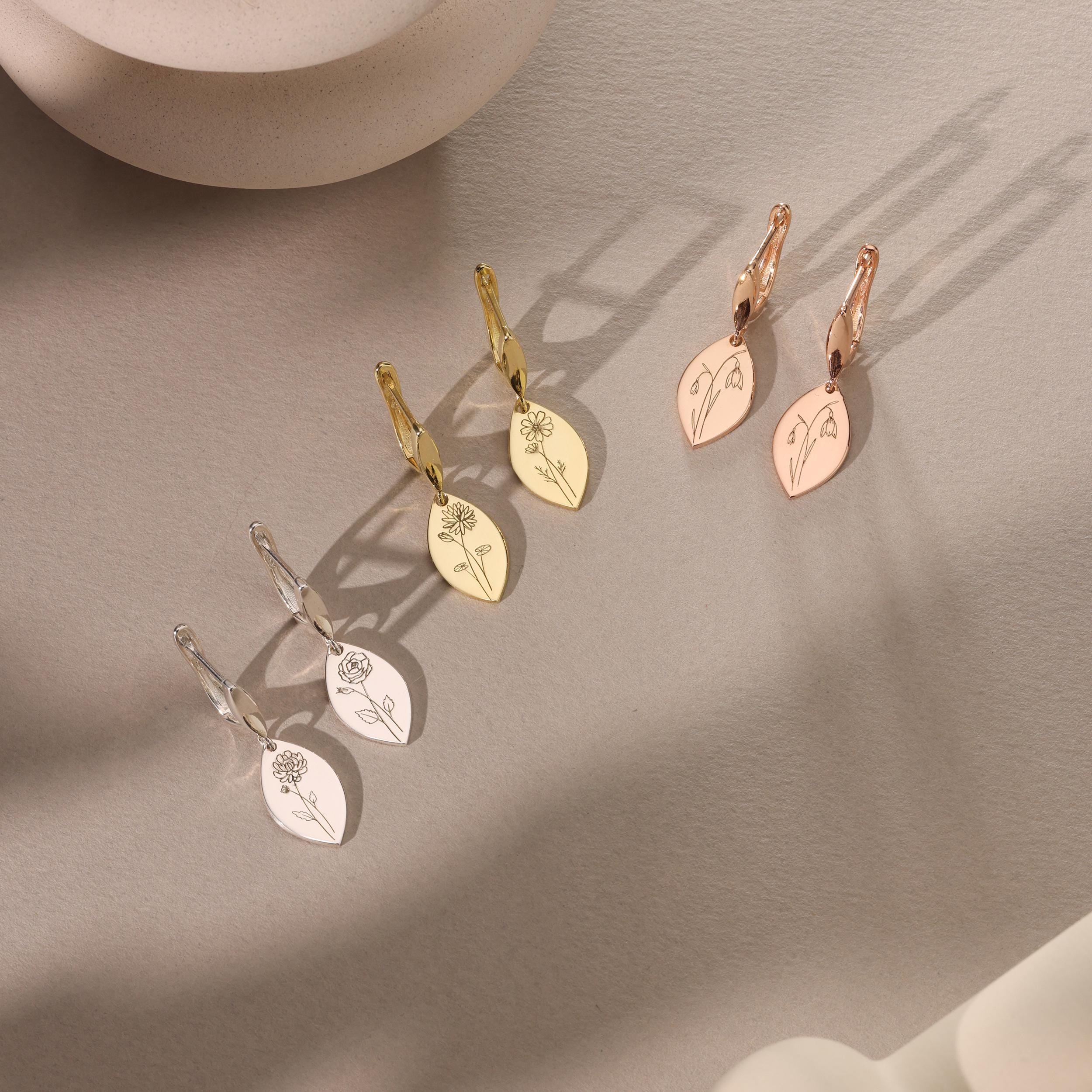 Personalized Birth Flower Earrings, Engraved Floral Jewelry